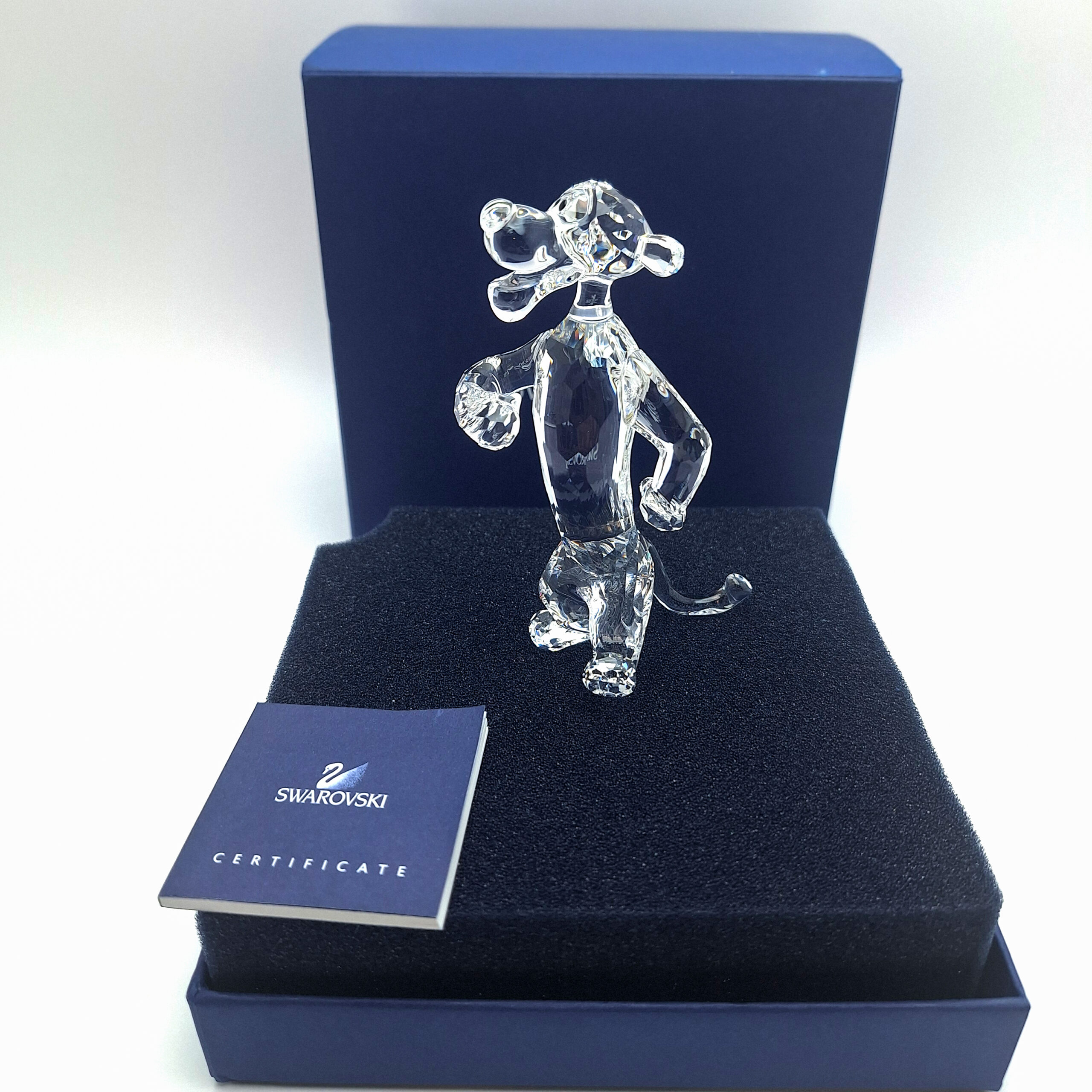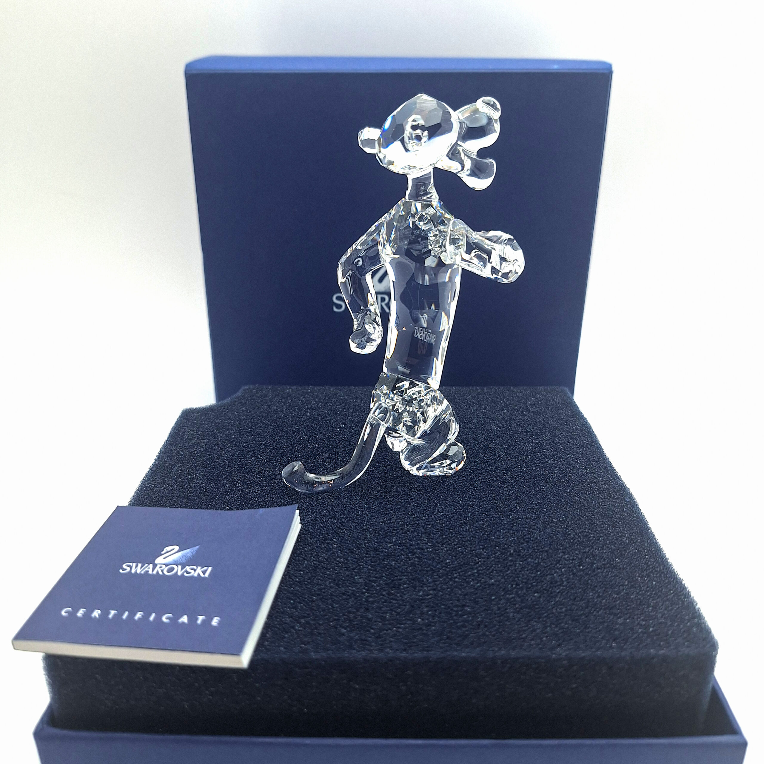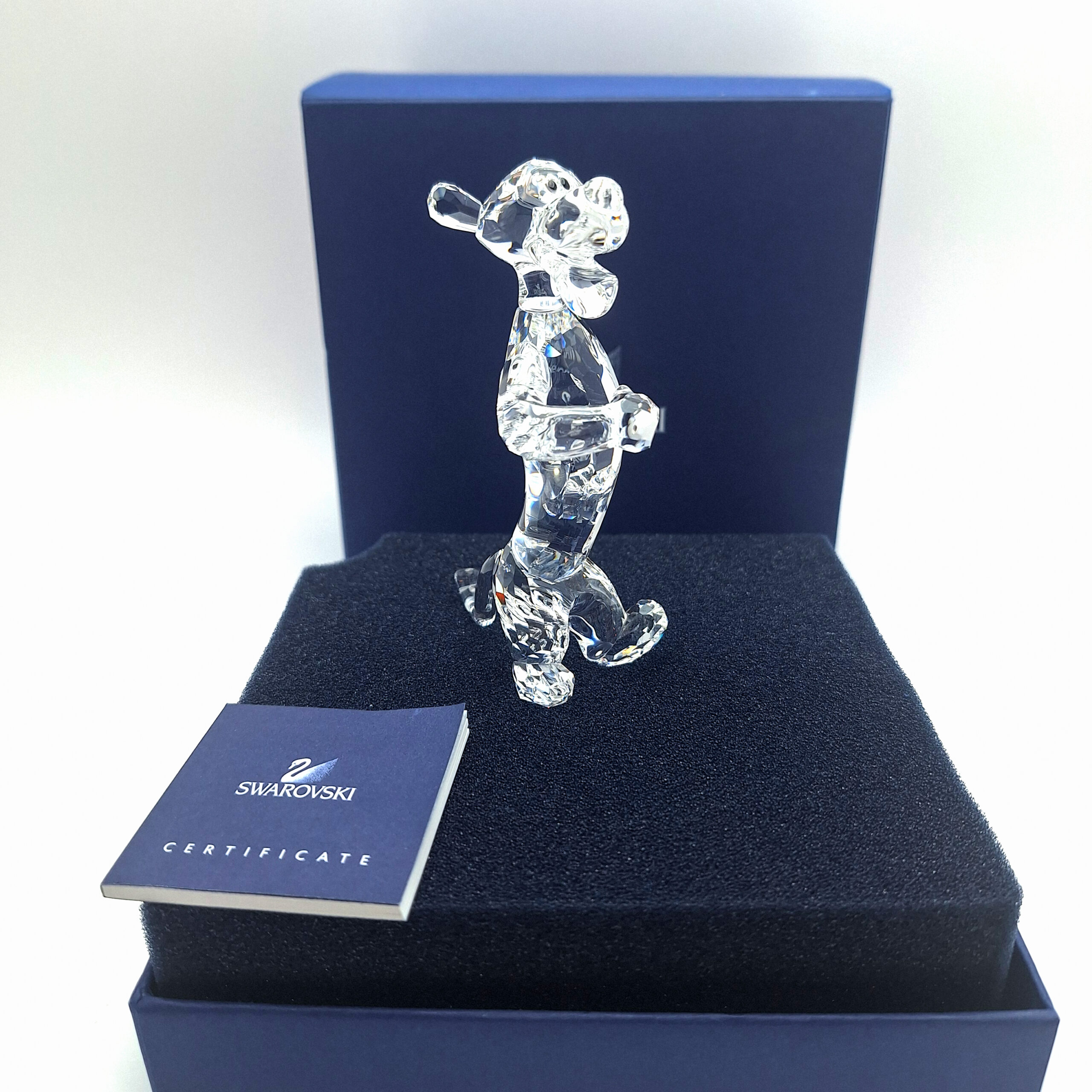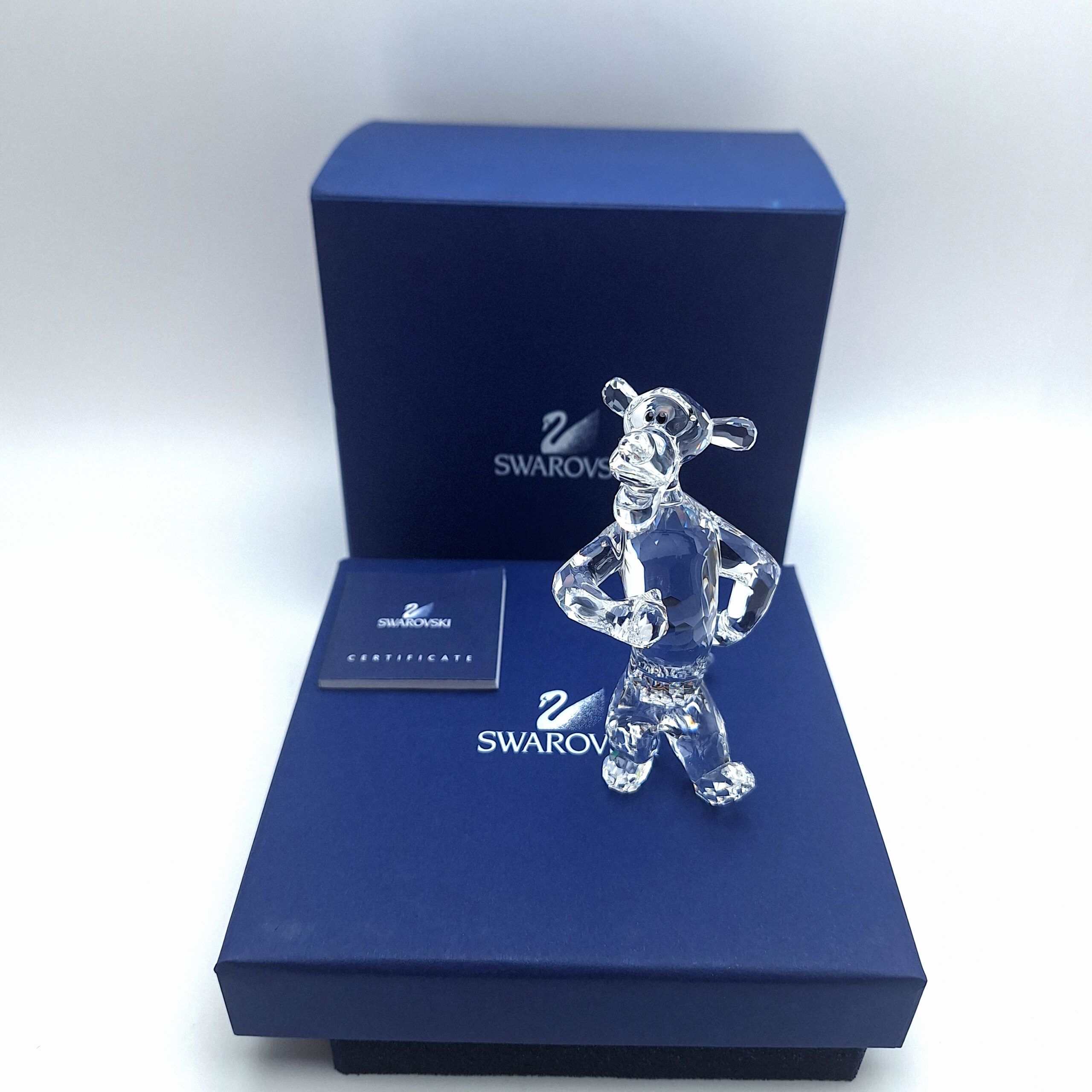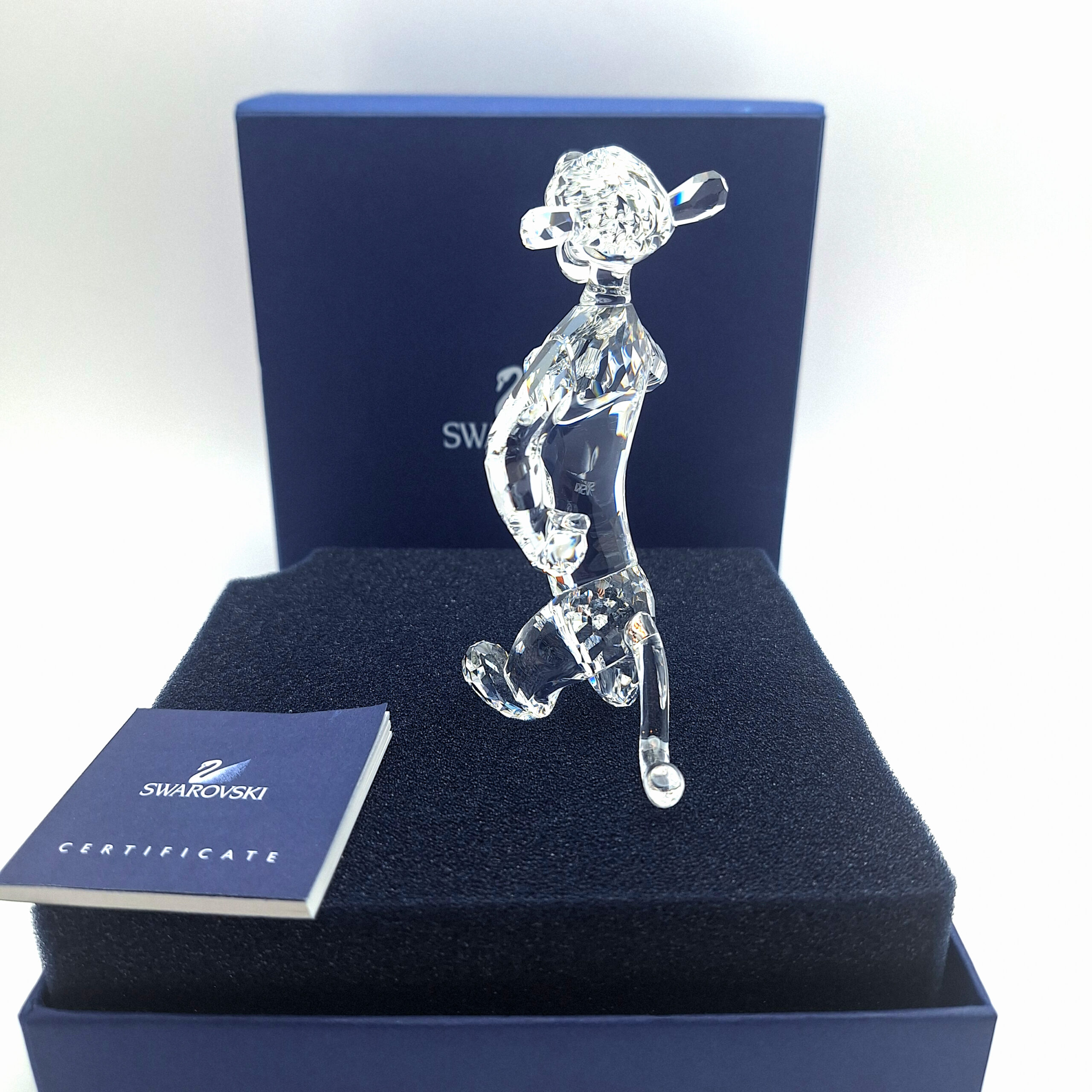 The Swarovski Tigger figurine is part of the Disney Winnie the Pooh Collection, crafted in stunning clear crystal. Released in 2007 and retired in 2010, this collectible captures Tigger’s energetic and confident personality with elegant detail. It features fully faceted clear crystal for the body, a smooth crystal face and back, and Jet crystal eyes. A must-have for Disney and Swarovski collectors.